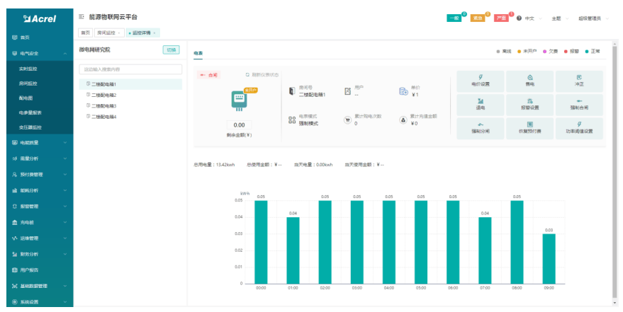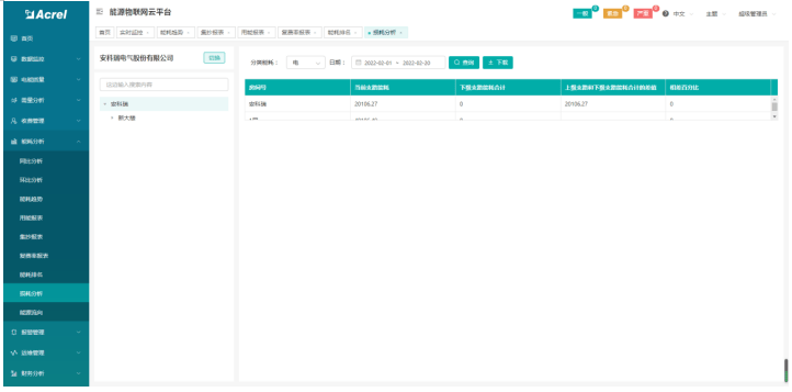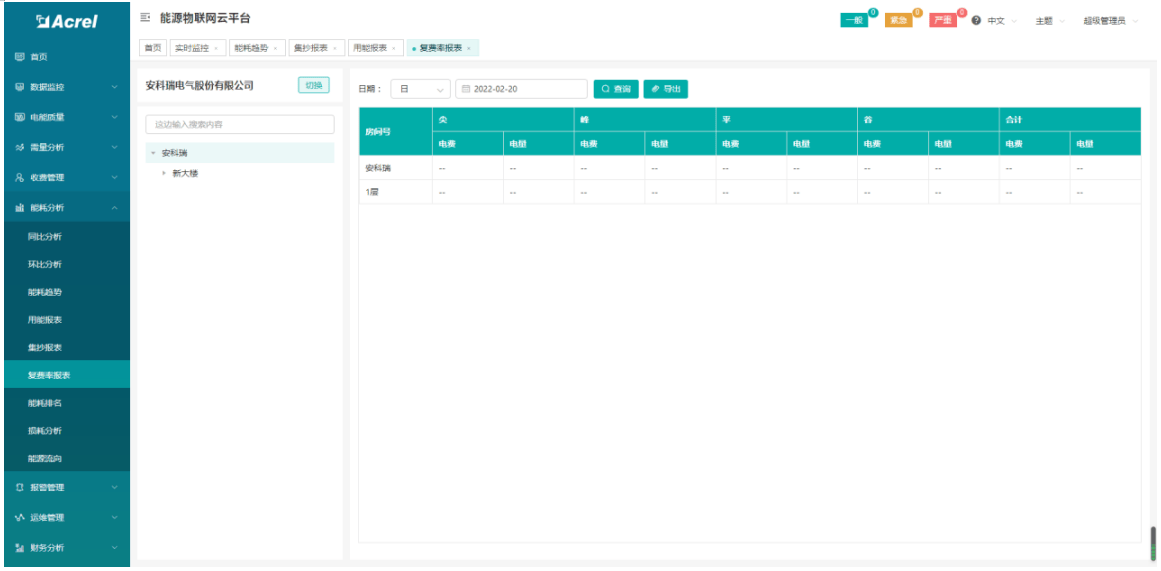 復(fù)費(fèi)率報(bào)表主要統(tǒng)計(jì)一個(gè)建筑中尖、峰、平、谷電能及電費(fèi)。選中需查看的項(xiàng)目,支路及日期,選擇“日",“月",“年"其中一種報(bào)表類型。點(diǎn)擊“查詢",即可查看該支路的復(fù)費(fèi)率報(bào)表;點(diǎn)擊“導(dǎo)出"可導(dǎo)出表格。如圖所示。注:此報(bào)表需要計(jì)量裝置支持分時(shí)段統(tǒng)計(jì)功能。